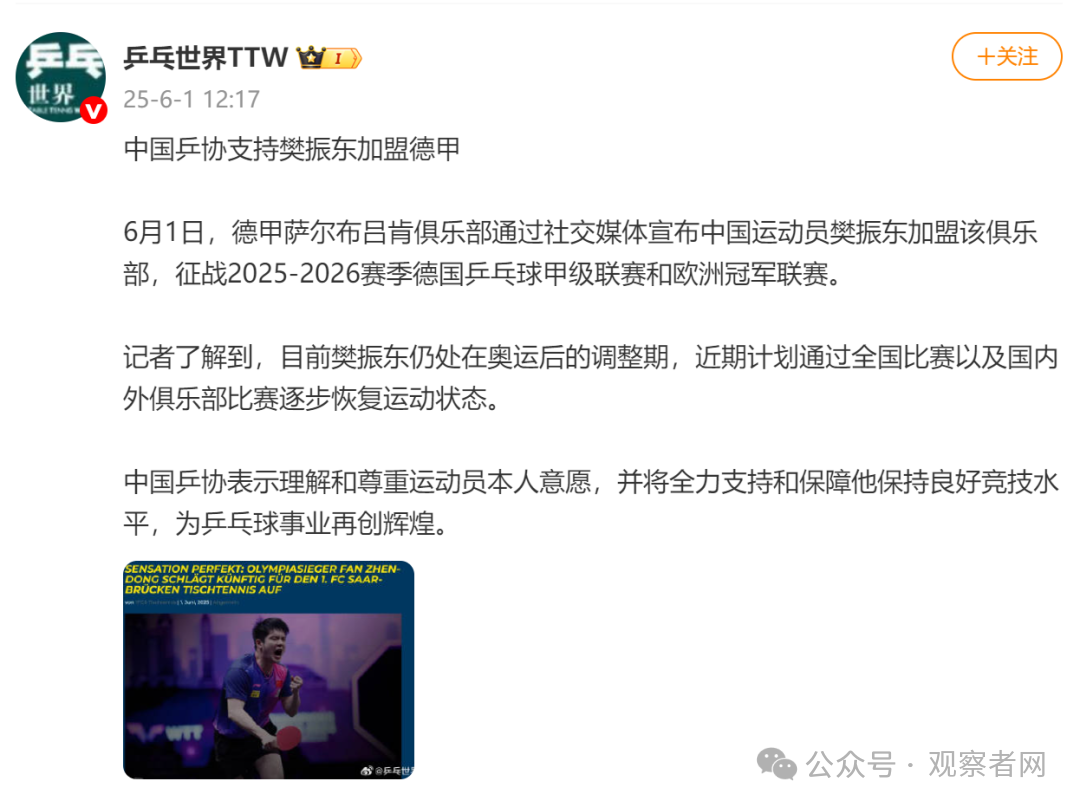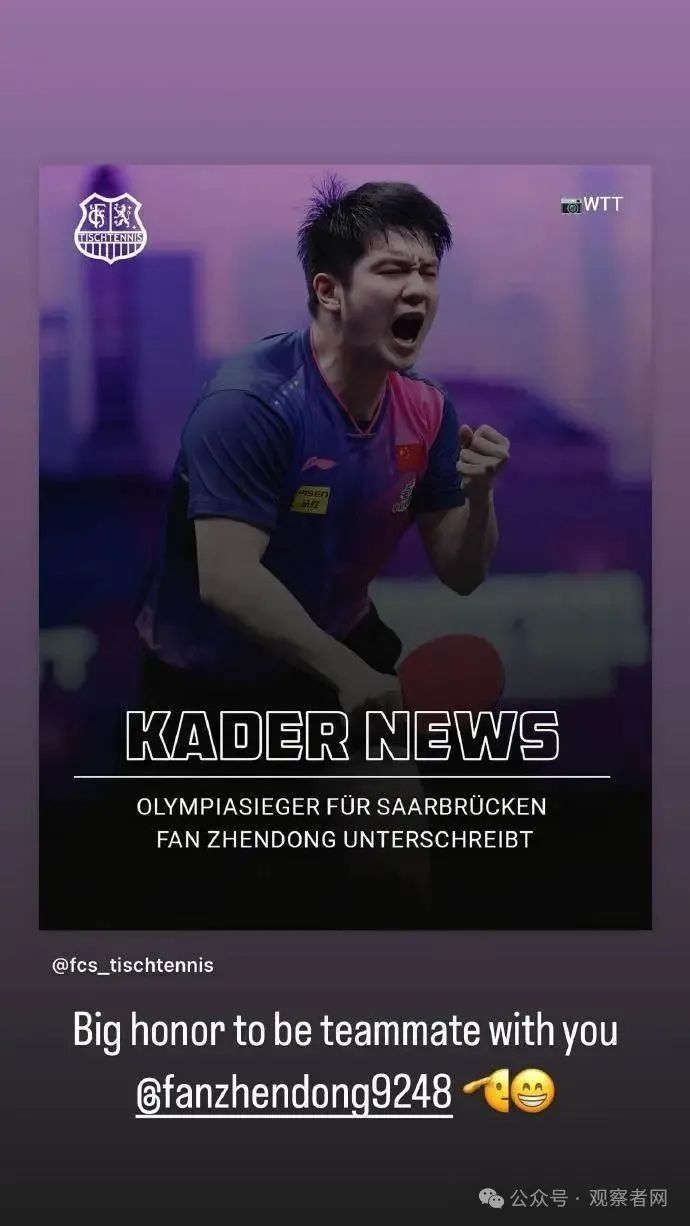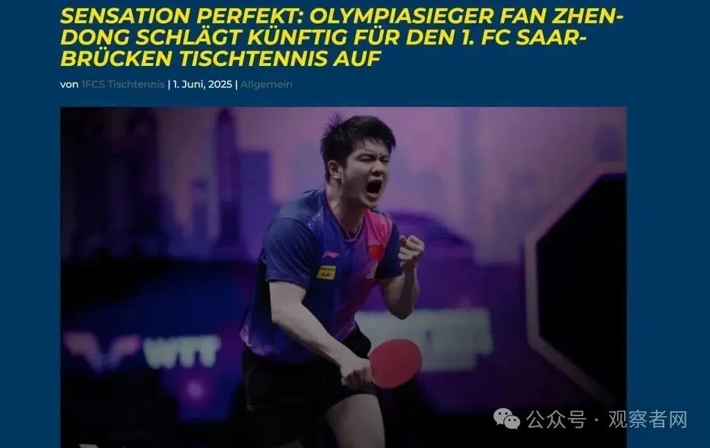 6月1日,德甲萨尔布吕肯俱乐部通过社交媒体宣布中国运动员樊振东加盟该俱乐部,征战2025-2026赛季德国乒乓球甲级联赛和欧洲冠军联赛。